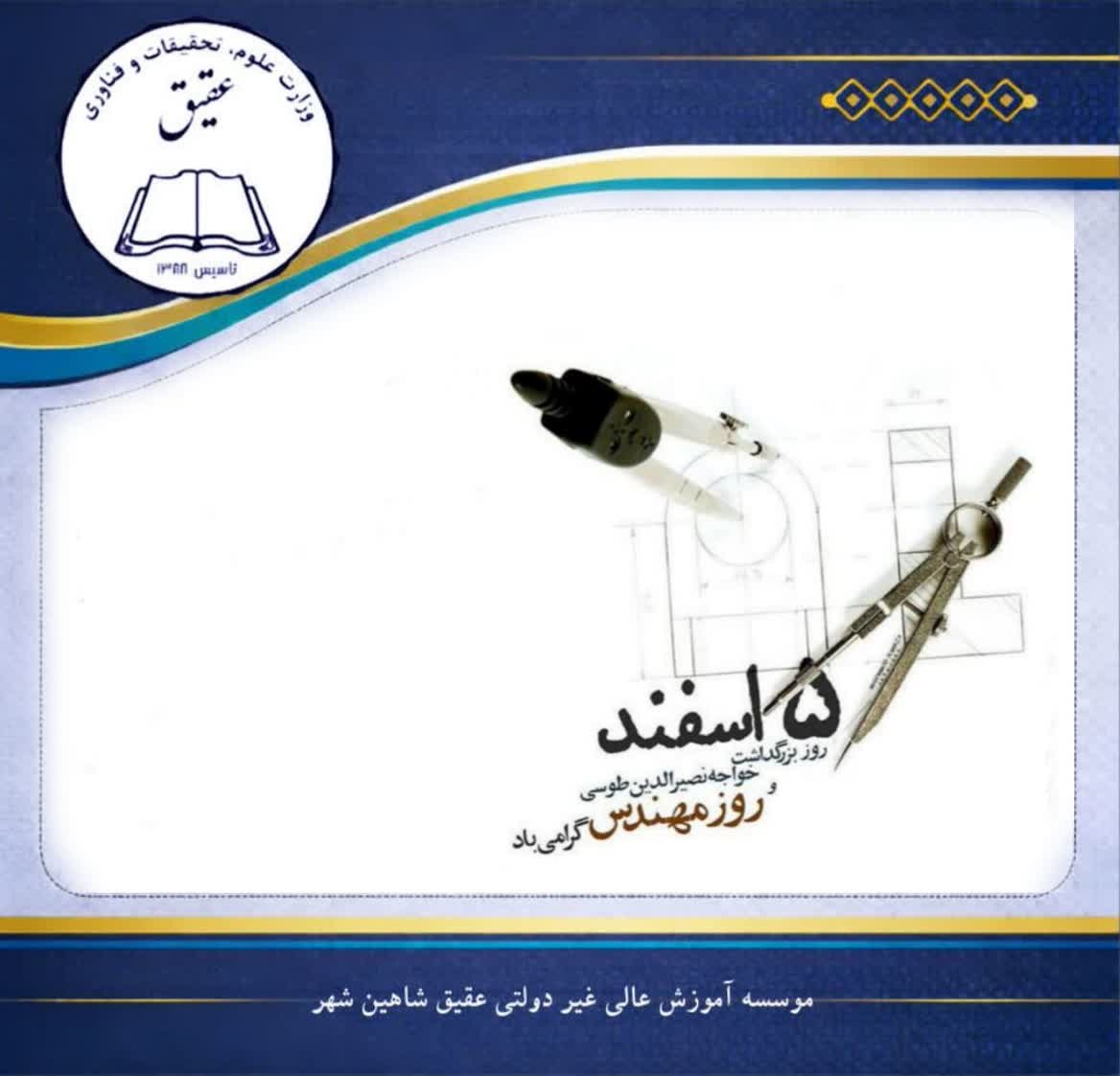 مؤسسه آموزش عالی عقیق شاهینشهر، روز بزرگداشت دانشمند و فیلسوف بزرگ ایران خواجه نصیرالدین طوسی و روز مهندس را به همۀ فعالان عرصه مهندسی تبریک میگوید.