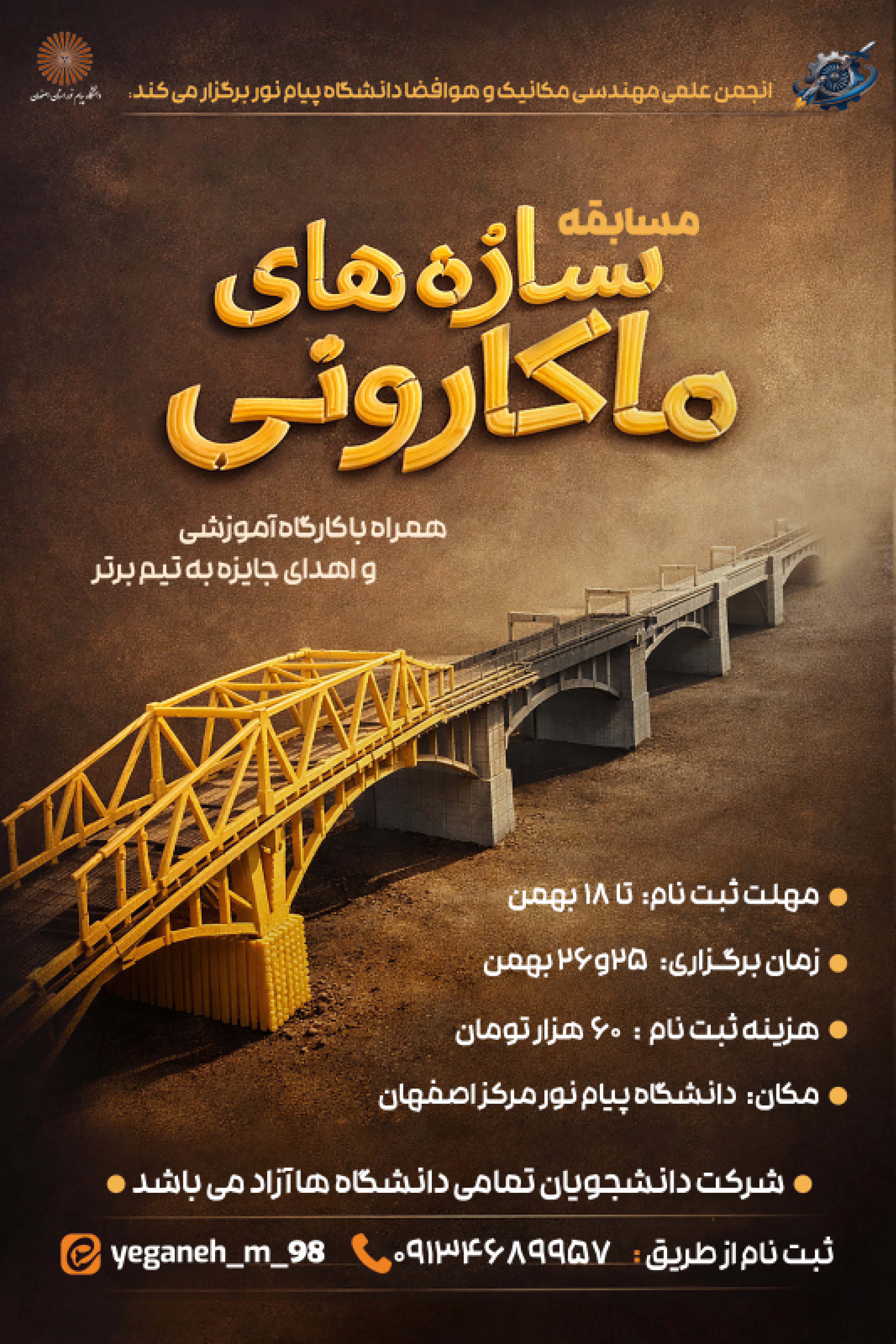 انجمن علمی مهندسی مکانیک و هوافضای دانشگاه پیام نور استان اصفهان، در راستای تقویت خلاقیت و مهارتهای مهندسی دانشجویان، مسابقه جذاب «سازههای ماکارونی» را برگزار میکند.